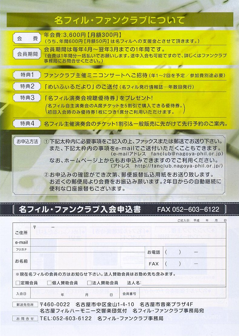 | 会員特典3 | 名フィル主催演奏会のチケット1割引&一般販売に先がけて先行予約のご案内。 |